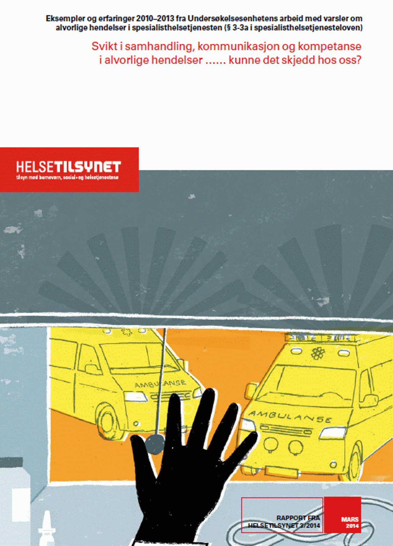 In this report, the Norwegian Board of Health Supervision presents examples and describes the experience we have gained from investigation of serious adverse events that have been reported to us during the period 1 June 2010 to 31 December 2013. We describe reports from various hospital departments, how we have dealt with these reports, and the assessments we have made. We also present statistics giving an overview of the number of reports from the different health trusts and hospital departments.