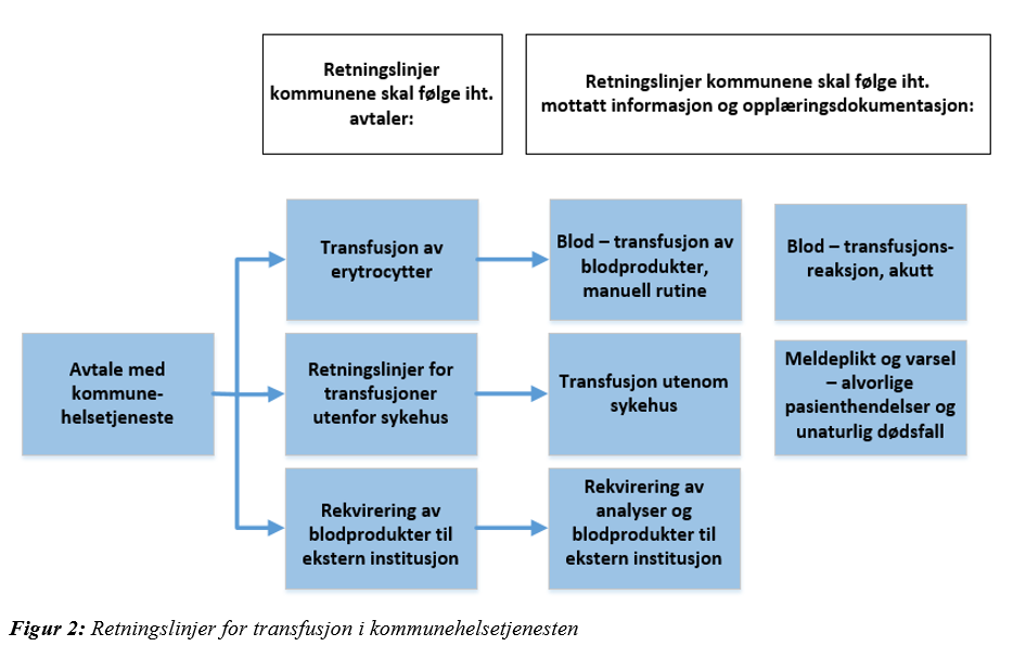 - Helsetilsynet har fått opplyst at kommunehelsetjenesten i tillegg skal følge to andre prosedyrer. Prosedyrene er tilgjengelig på helseforetakets nettside, og listet opp i dokumentet «Opplæring i transfusjon av erytrocytter». Blodbanken signerer opplæringsdokumentet og overleverer dette til den enkelte ansatte i kommunehelsetjenesten som dokumentasjon på gjennomført opplæring i transfusjon. Kommunehelsetjenesten er ikke oppgitt som målgruppe i disse to prosedyrene.